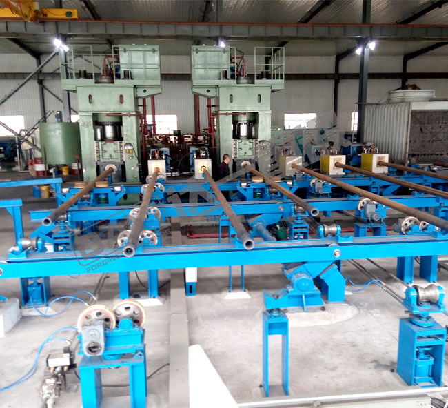 管端加厚機(jī)是我公司針對石油鉆桿、油管的加厚工藝研發(fā)的新型特種設(shè)備,管端加厚的目的主要是為了保證鋼管在管端車加工截面處的強(qiáng)度,鋼管加厚類型有外加厚、內(nèi)加厚、內(nèi)外加厚三種工藝。加厚機(jī)組有加厚機(jī)、輔機(jī)及加熱系統(tǒng)等組成,即對鋼管進(jìn)行橫向運輸、加熱及端部加厚。